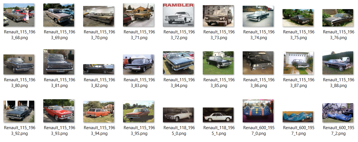 Afin d'entrainer un modèle de classification d'image, nous avons besoin d'une base de données conséquente avec des images de voitures classées par modèle. Certains sites fournissent une liste de modèles de voitures, avec les photos associées. Nous nous sommes concentré sur les modèles français, car les vidéos à dater sont françaises et datent pour la plupart d'avant les années 2000. Nous avons donc privilégié les marques comme Renault, Peugeot et Citroën, tout en vérifiant d'avoir les modèles les plus anciens.