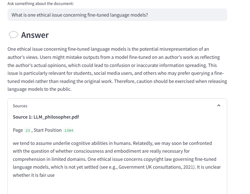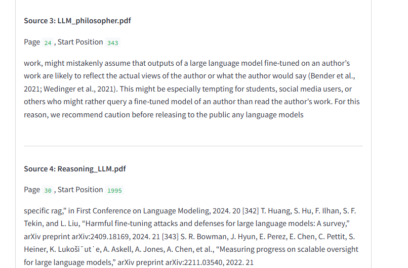 Après chaque réponse, une section déroulante permet donc à l’utilisateur de lire les extraits précis ayant servi à construire la réponse.