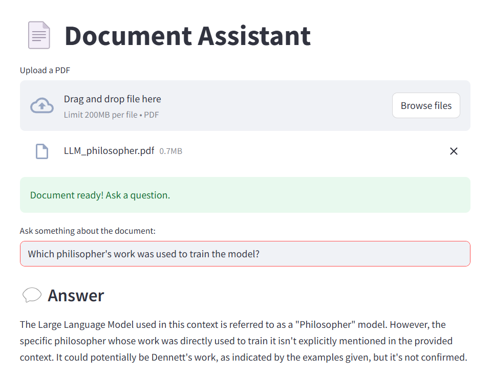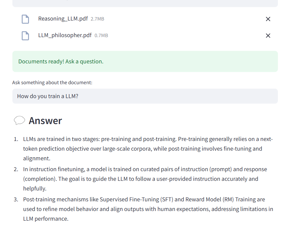 Je voulais apprendre à utiliser des modèles de génération de texte, et leur application dans un contexte de Retrieval Augmented Generation (RAG) m’attirait particulièrement. L’idée est de permettre à un utilisateur de charger ses propres documents, et de poser ensuite des questions auxquelles un modèle de langage (LLM) peut répondre, en s'appuyant directement sur ces documents.