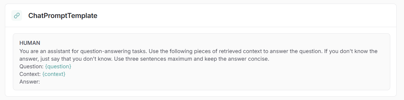 Ce prompt insère automatiquement la question et le contexte avant de les transmettre au LLM, qui génère alors une réponse précise.